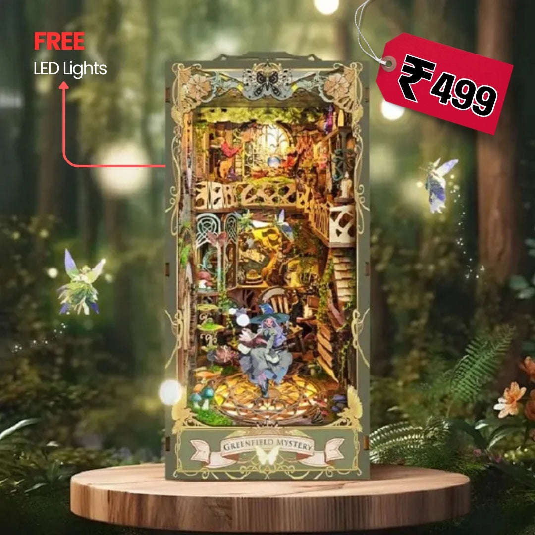 Step into our Green Fairyland book nook, adorned with whimsical hanging decorations. Discover the magic within every nook and cranny, perfect for adding a touch of wonder to your bookshelf. Let your imagination soar with this charming miniature world.