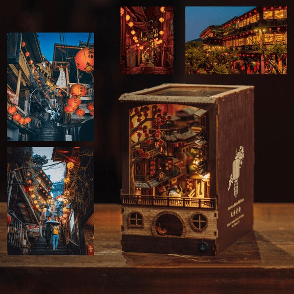 JiuFen Old Street is the newest addition to our book nooks collection, meticulously crafted to closely resemble its real-life counterpart in Taiwan, complete with hanging lanterns, sloping alleys bustling with locals and tourists, and a delightful array of Taiwan's famous night market snacks to explore.