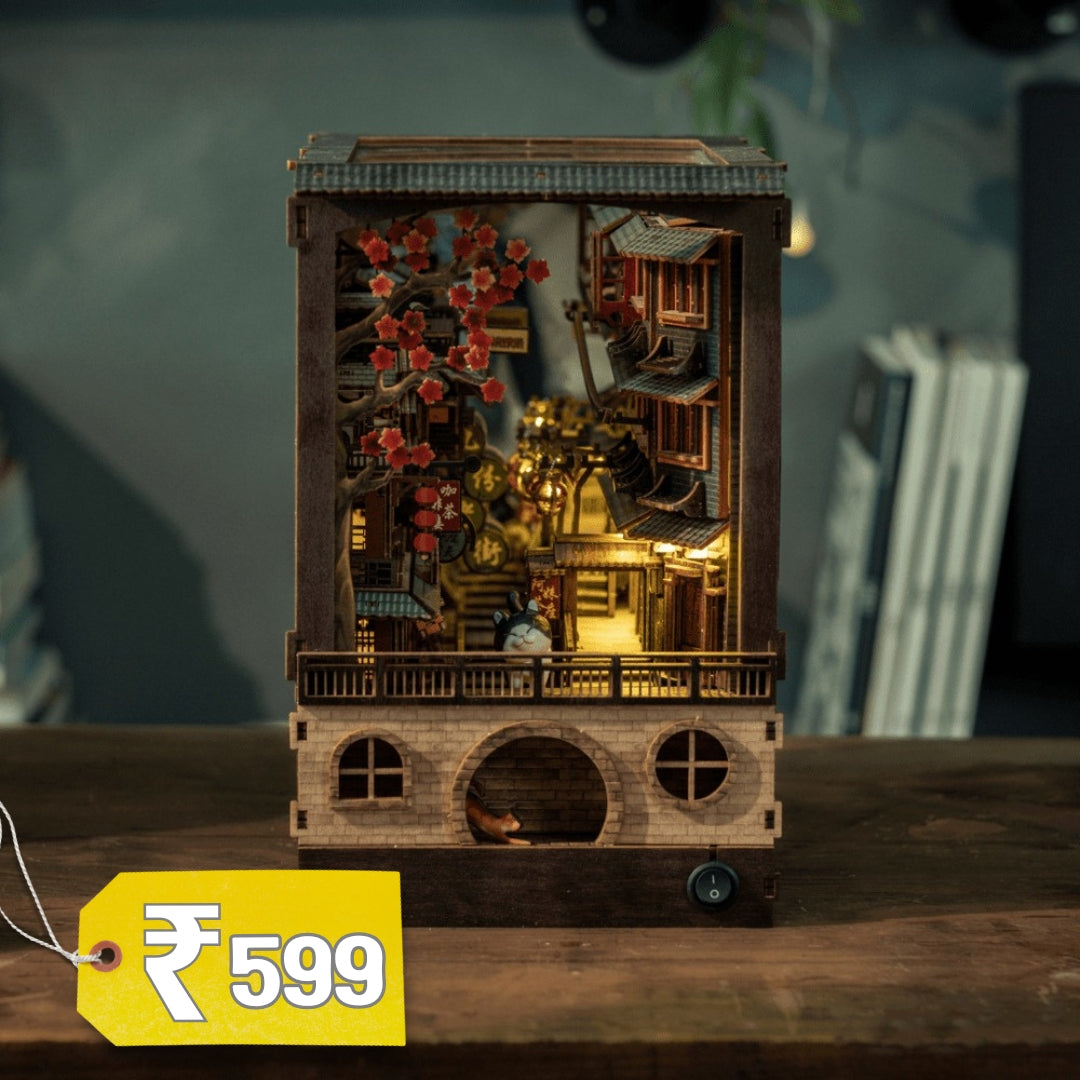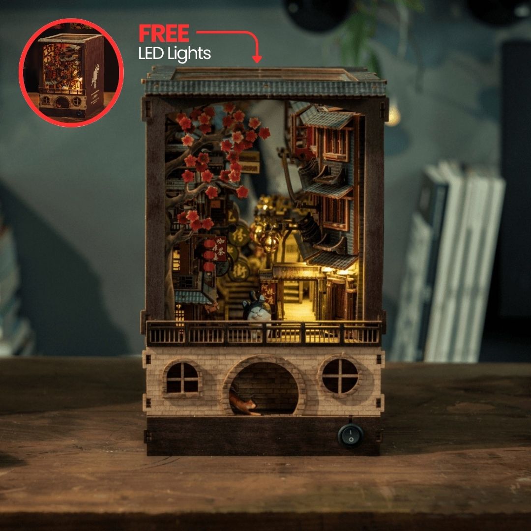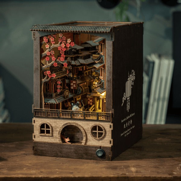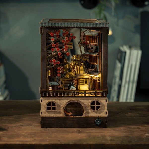 Experience assembling our JiuFen Old Street DIY book nook kit, which transports you to a charming and picturesque seaside mountain town in Taiwan. With the full bloom cherry blossom, the entire alley glows elegantly with hustle and bustle storefronts and patrons, vibrant lanterns, paired with traditional Chinese roof tiles, making you feel like you're right in the middle of this beautiful old street alley.
