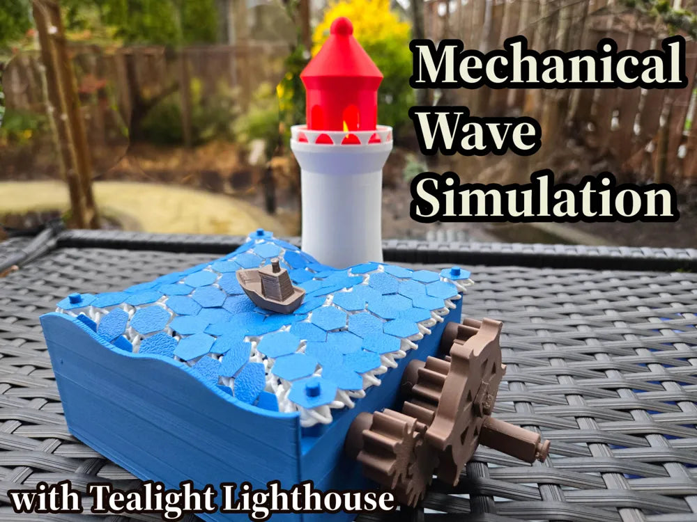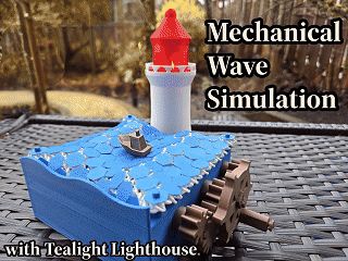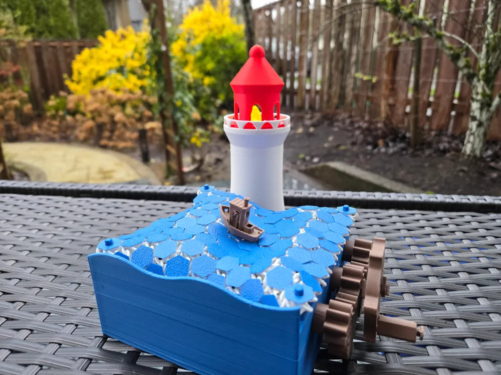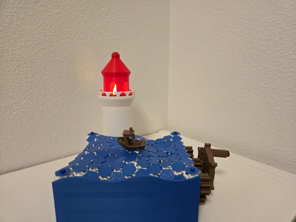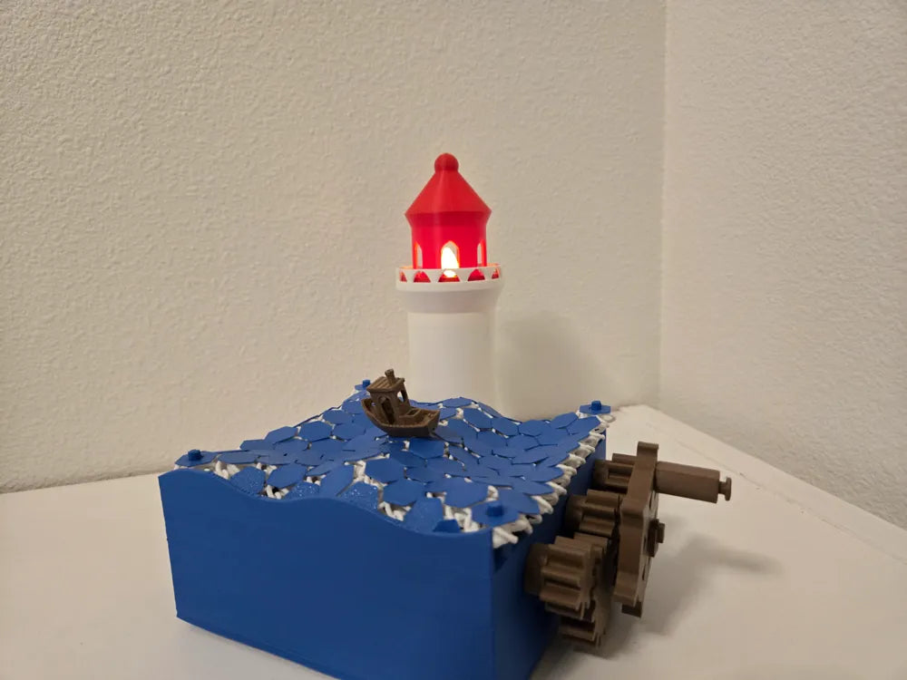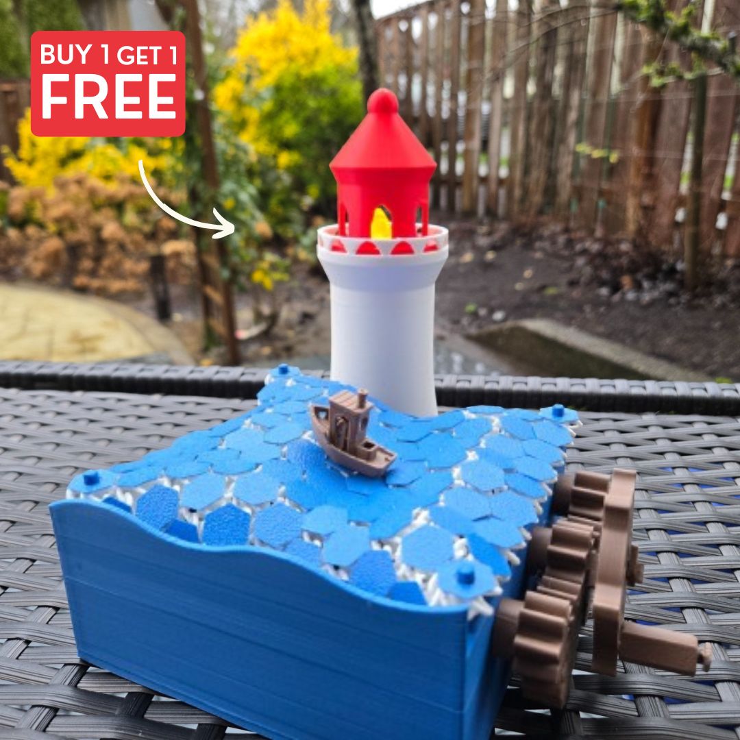A captivating hand-powered device that simulates realistic sea waves with a rotating wheel. A small boat rides the waves while a charming lighthouse holds an LED tealight for ambient glow.